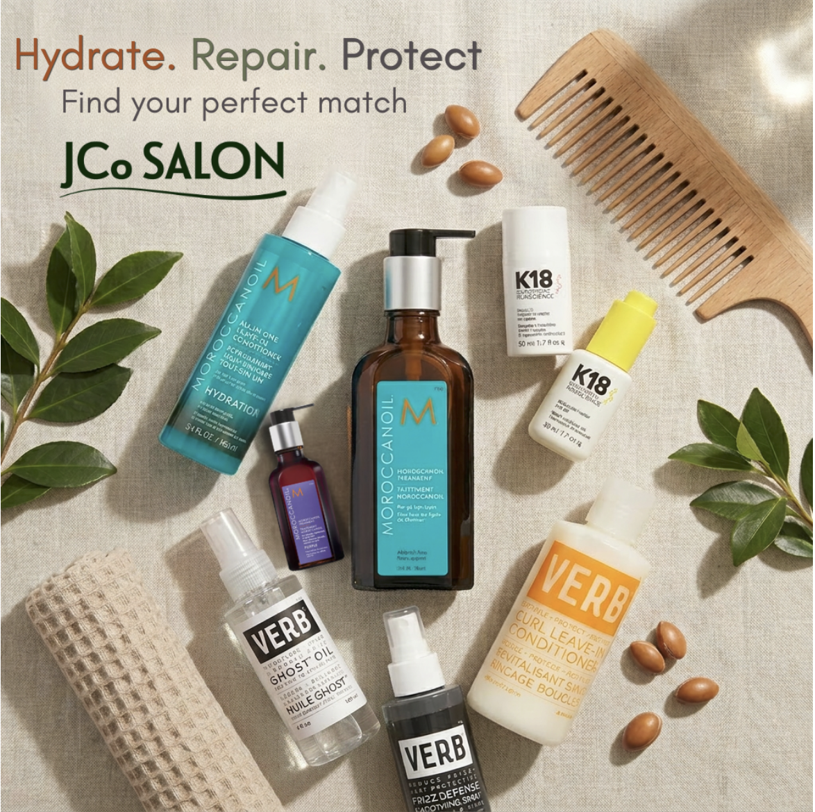 In the salon, we’ve curated options from brands we trust like Moroccan Oil, Verb, and K18—each designed to meet your hair where it is and support where it’s going.